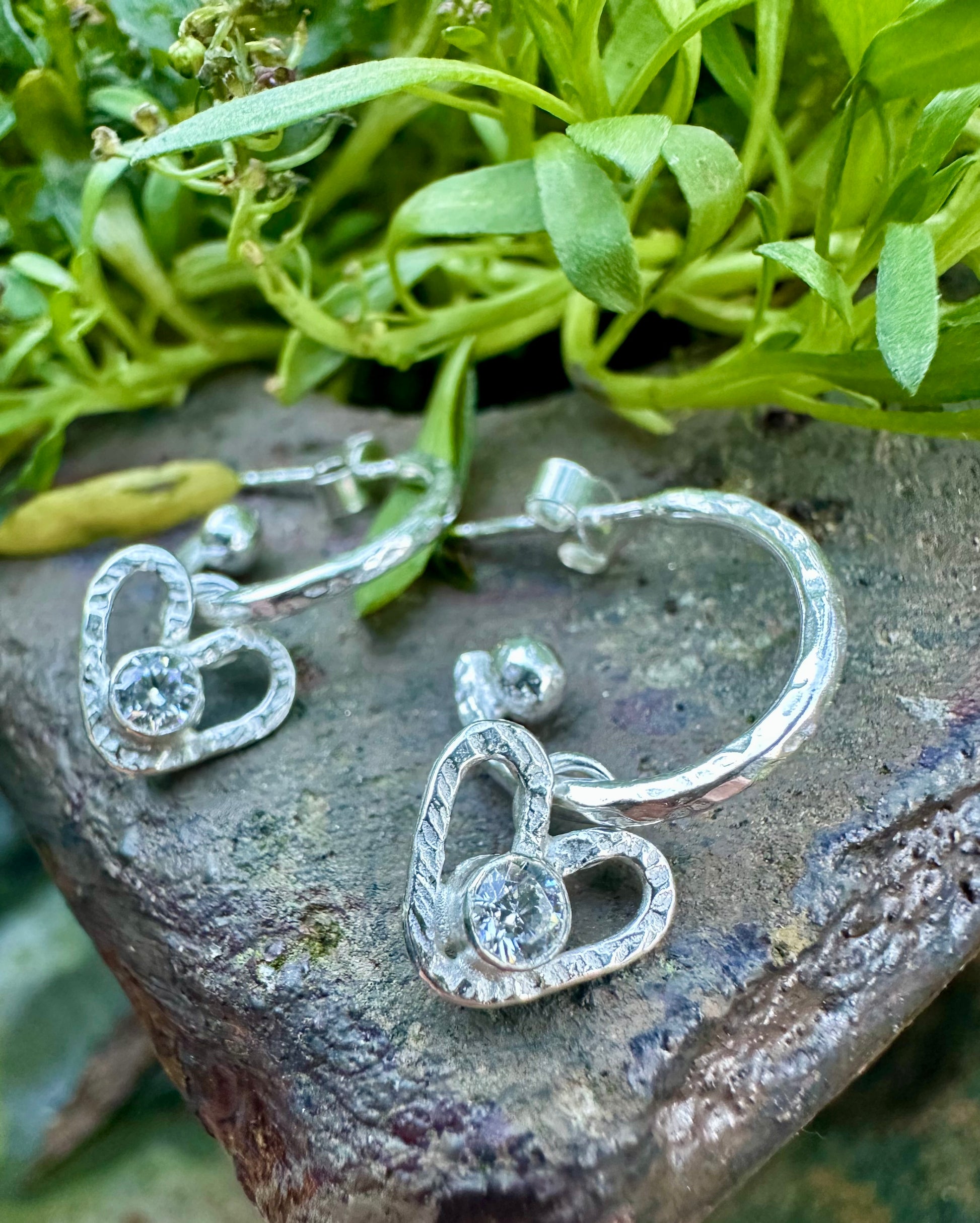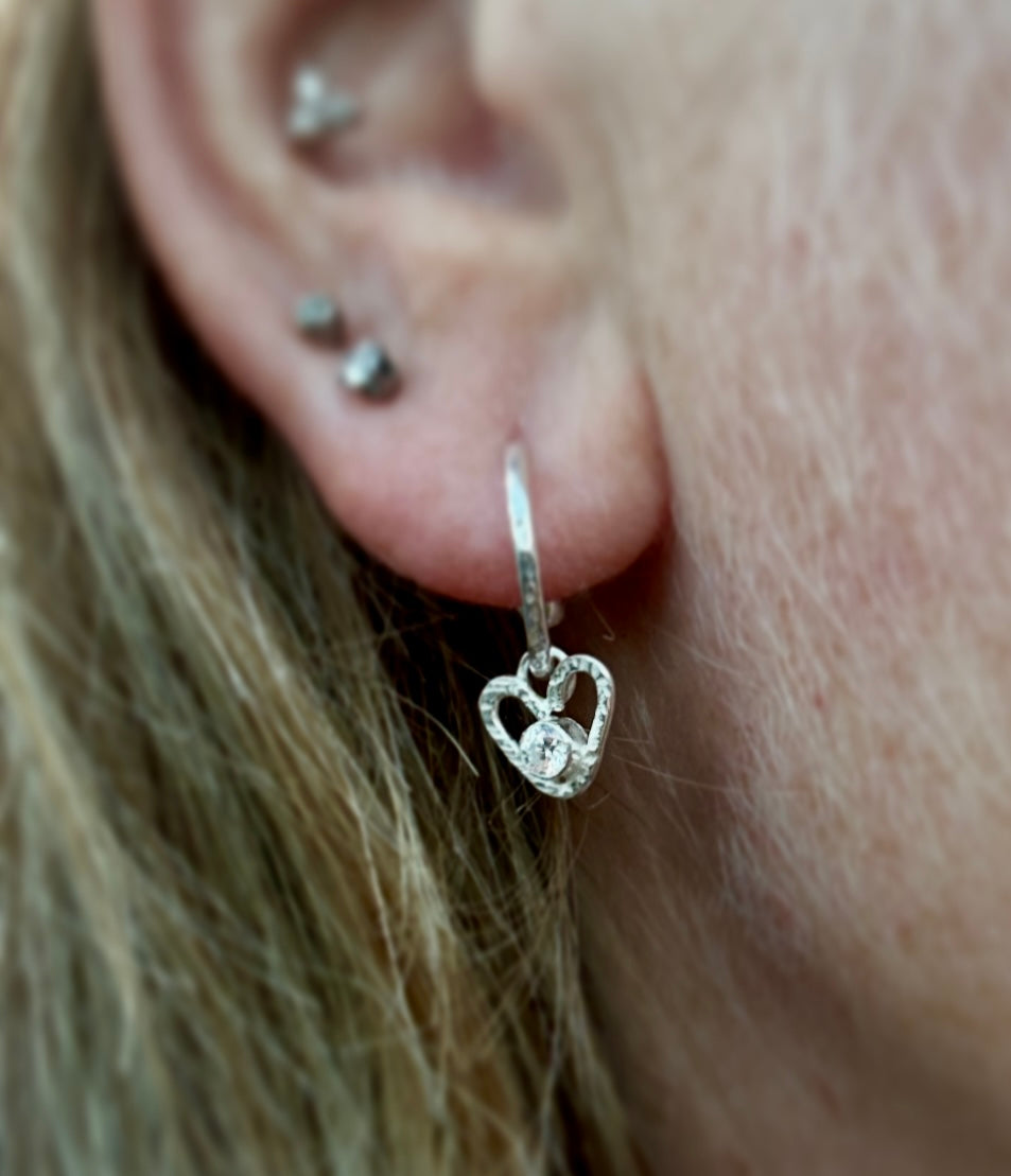These half hoop huggie earrings feature a hanging handmade heart charm with a 3mm CZ stone- which you can personalise!