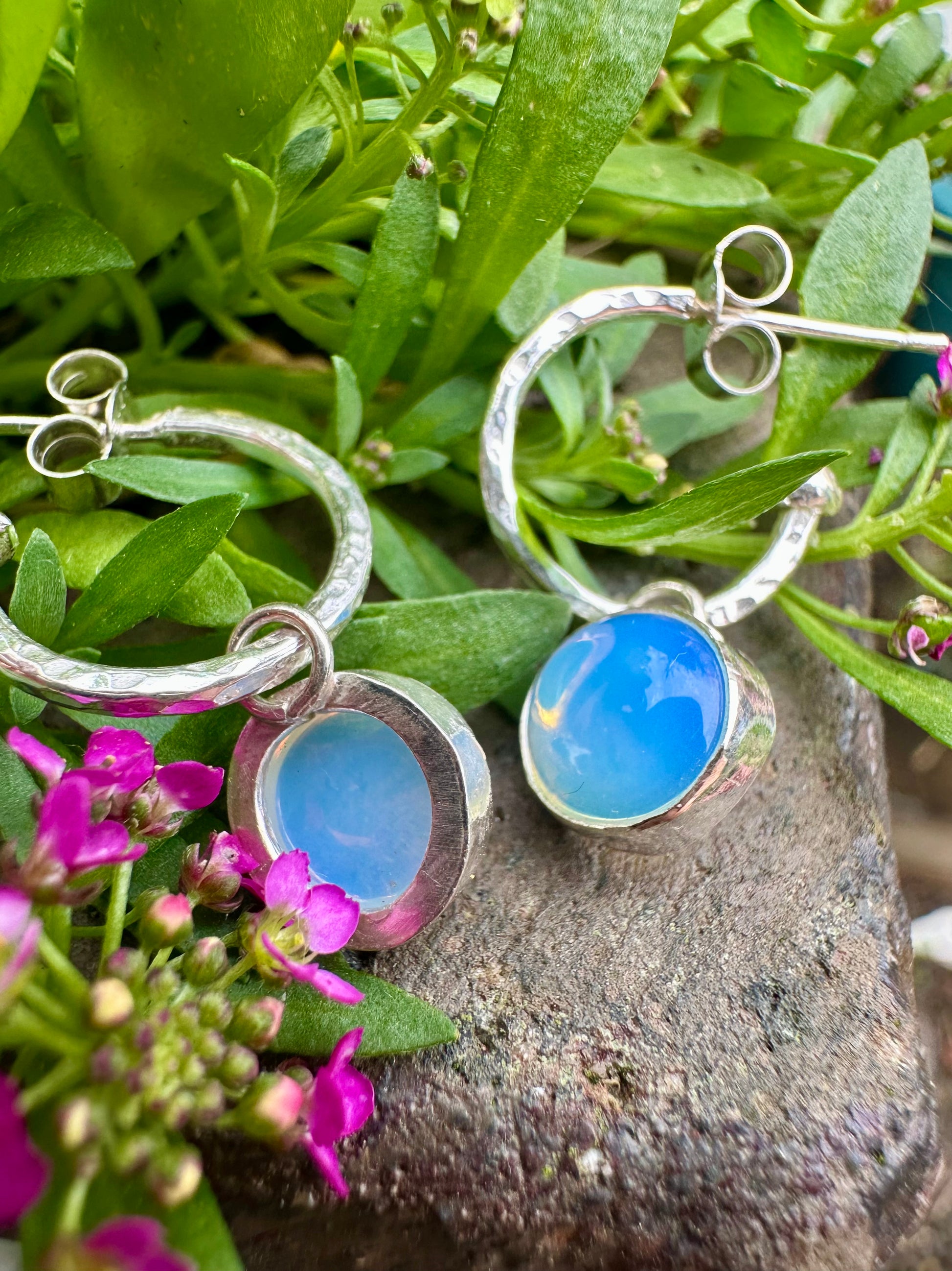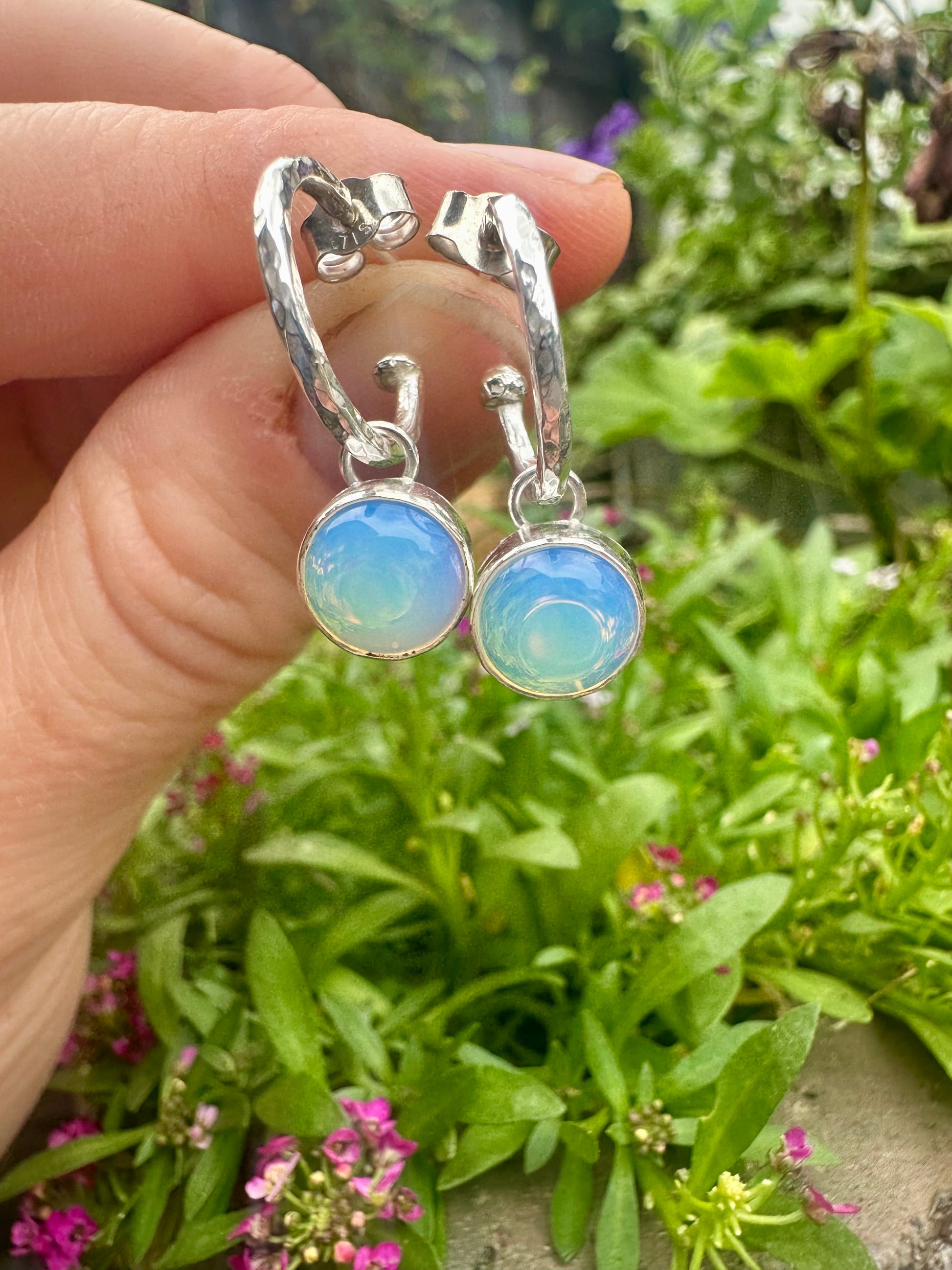 These half hoop huggie earrings feature a hanging Opalite cabochon stone.