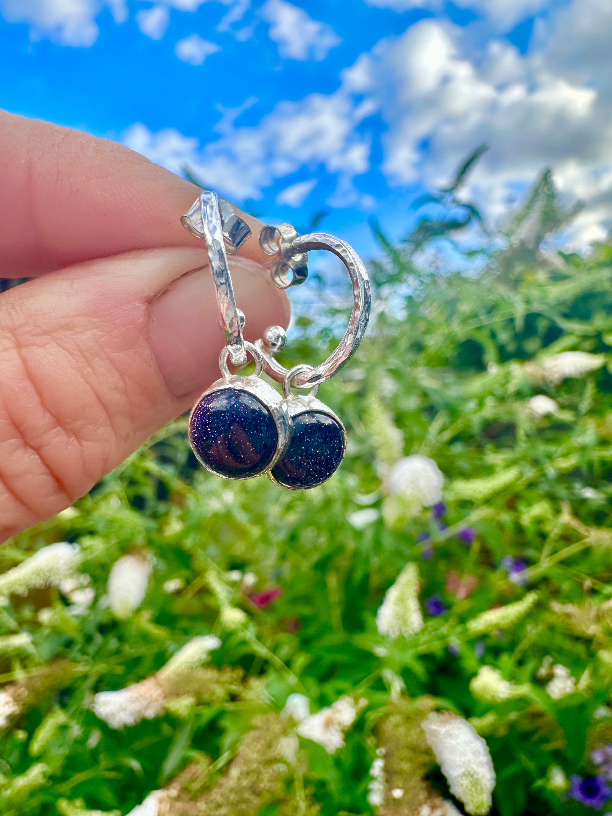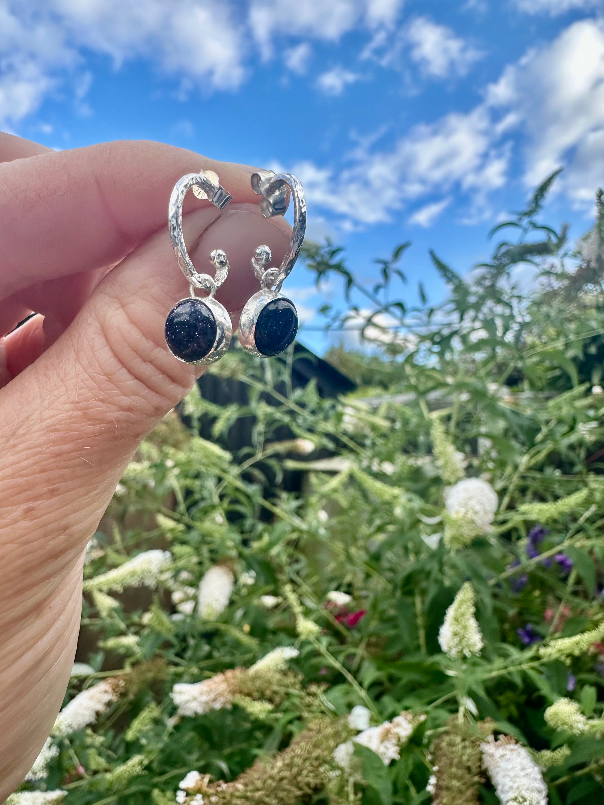 These half hoop huggie earrings feature a hanging Blue Goldstone cabochon stone.