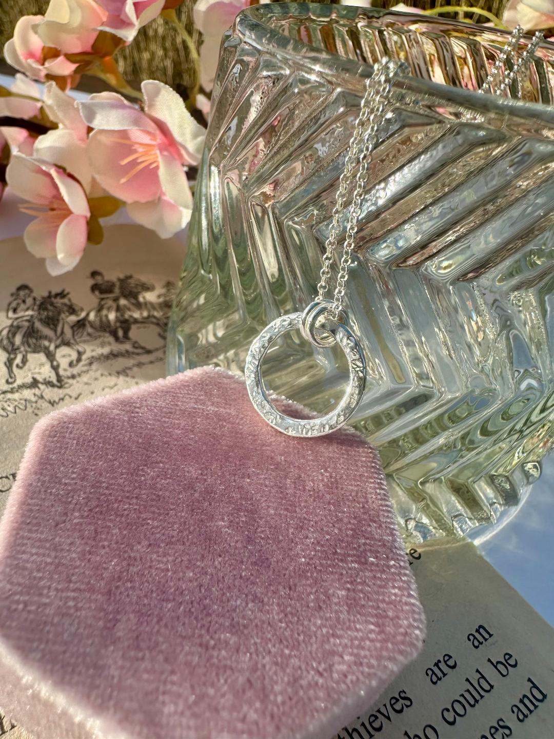 This hammered textured circle necklace is handmade in sterling silver with 2 smaller rings which hang from a delicate 1.4mm belcher chain.